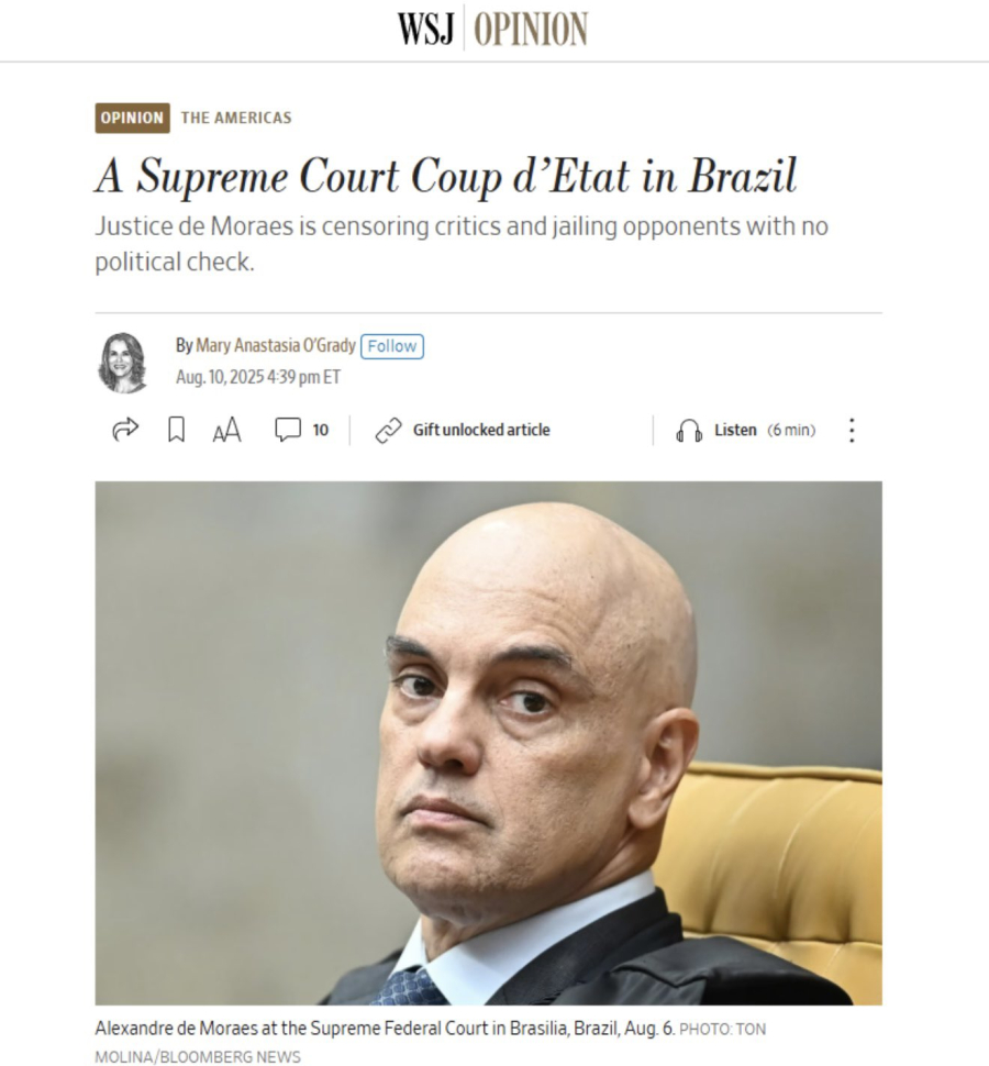 O STF, que deveria ser o guardião da Constituição, virou protagonista de um espetáculo preocupante. A “democracia” no Brasil, segundo o WSJ, está sendo minada com sofisticada caneta, censura e justiça seletiva.